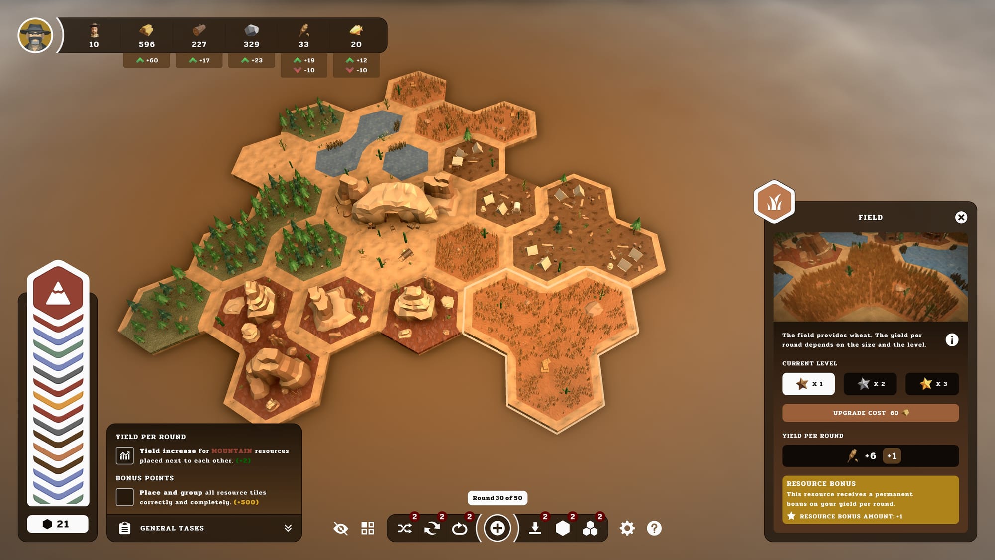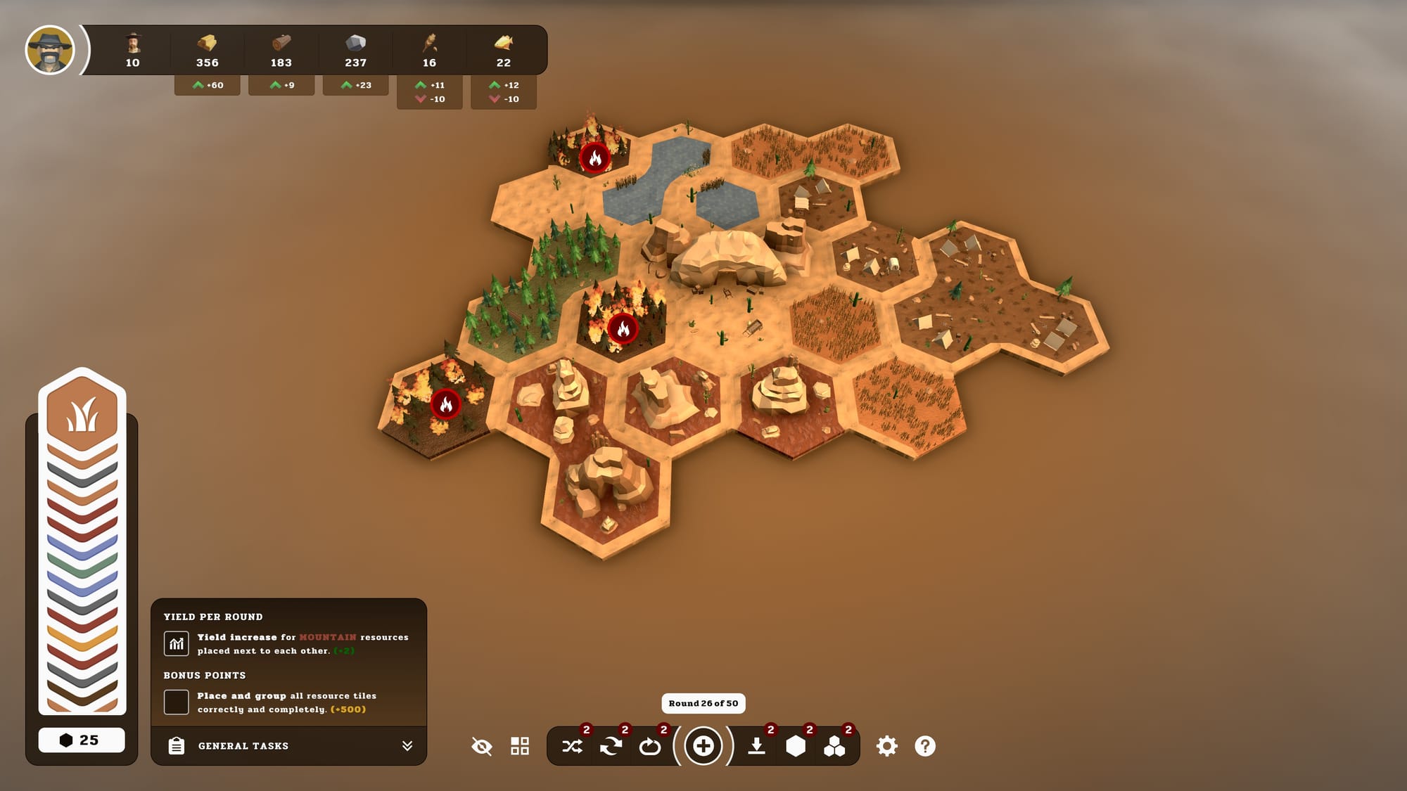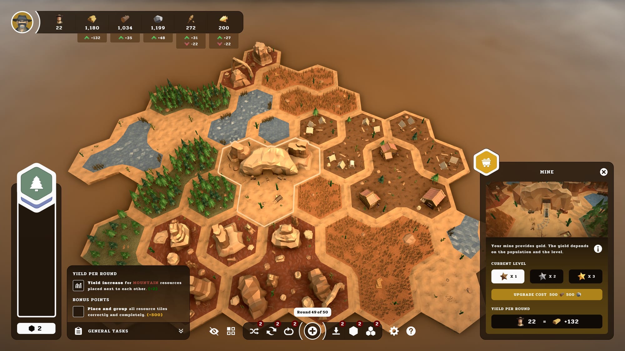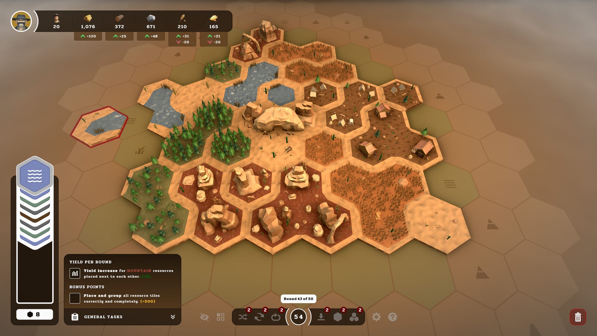 A game about laying down hexagonal tiles to provide people and resources to keep a mine running. Why? I'm not sure the game knows either. It scores you based on the gold you mine, but it's on a fixed round limit and you're unlikely to make unintentional mistakes or get cornered into expansion choices like in dorf romantik. You just... place 50 tiles, do a few events along the way, upgrade some stuff, and you're done. A lot of systems, not a lot of game