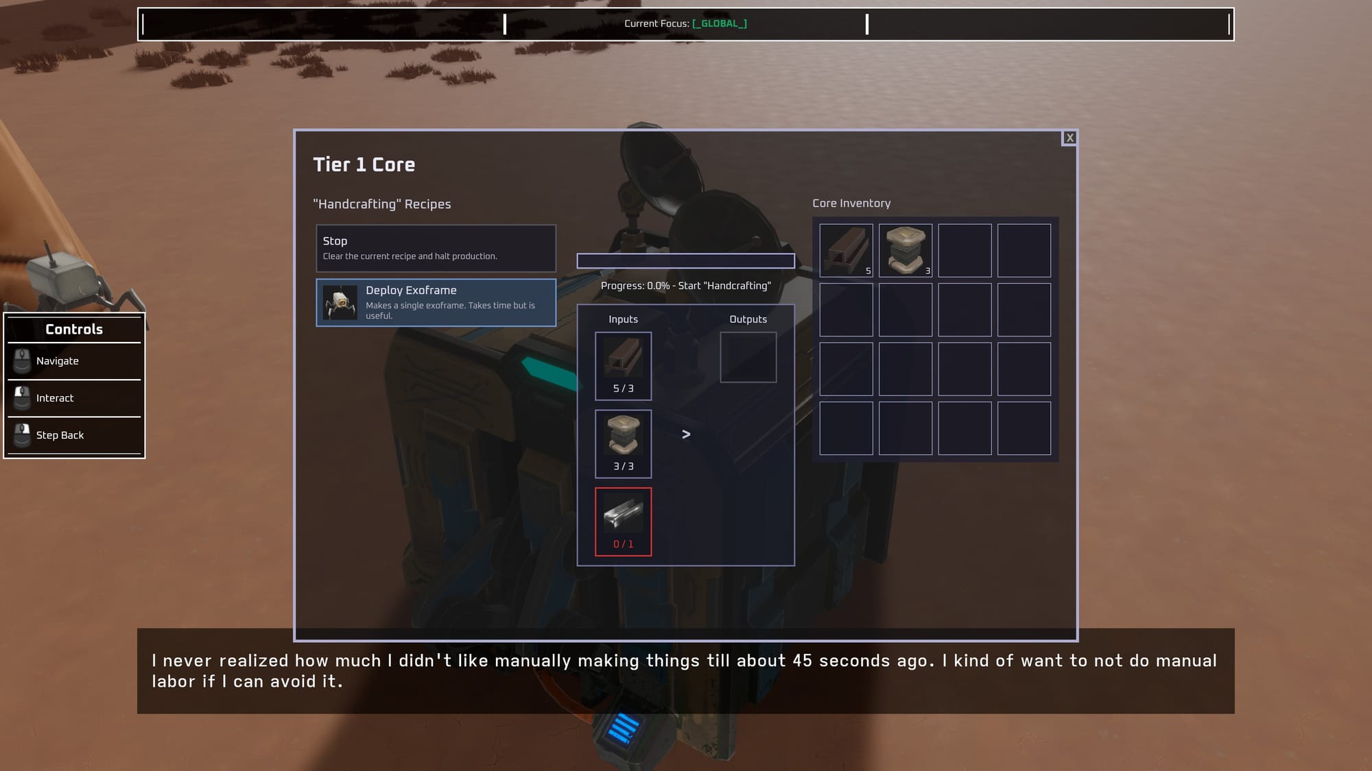 This demo is best described as clunky. Does it work? Yes. But the world is uninteresting, movement is stuttery for some reason, and building is cumbersome. This is an extremely early alpha of a game with very little actual content, and unpolished systems. I actually forgot to take screenshots of the factories themselves, but there is no autosave and you're not missing out on much of anything, really