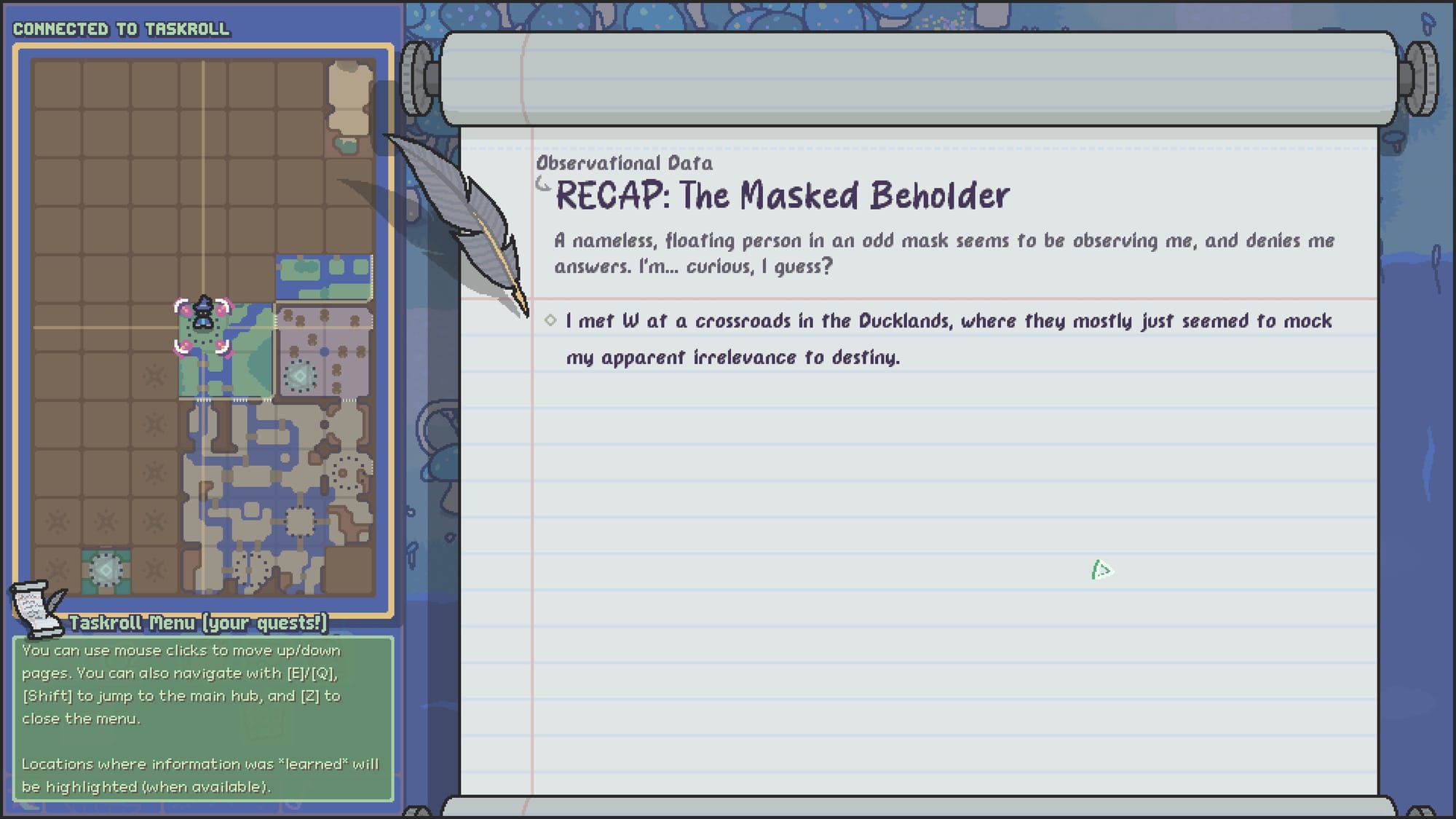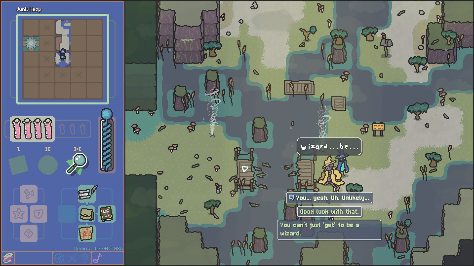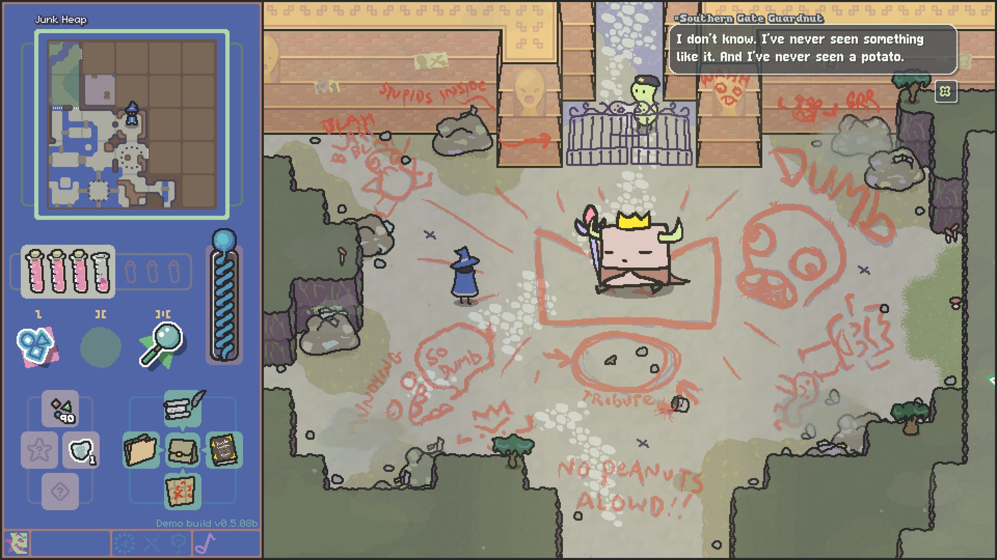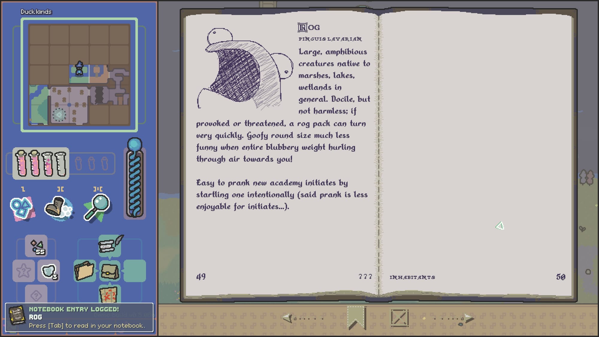 And the whimsy doesn't stop in the world, it permeates the plot, dialogue, and even UI. Most of the information about basically everything will be collected by casting a "scry" spell, which then fills your notebook with scribbles about all sorts of creatures, friendly and not. Diegetic UI slaps when done right, and this one is a perfect match for the game.