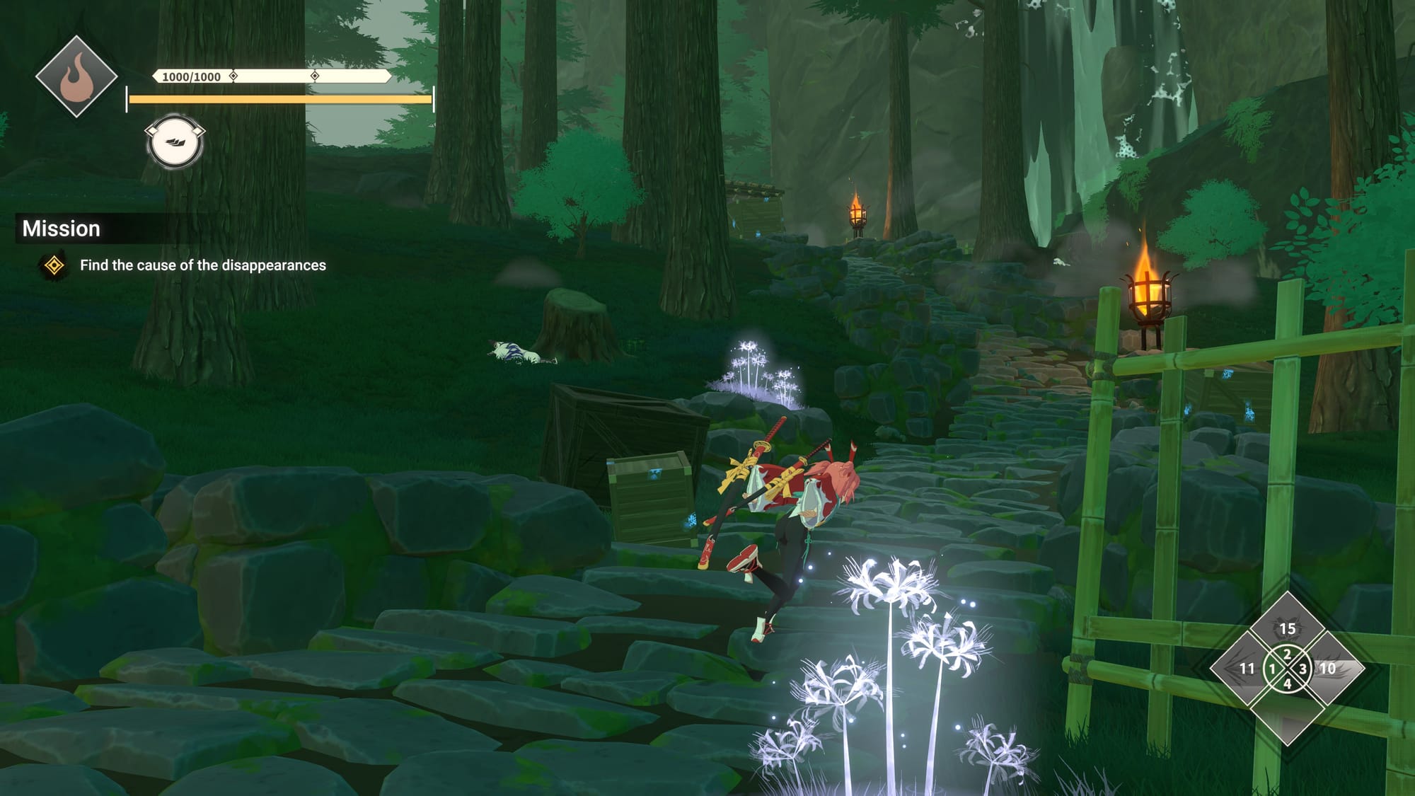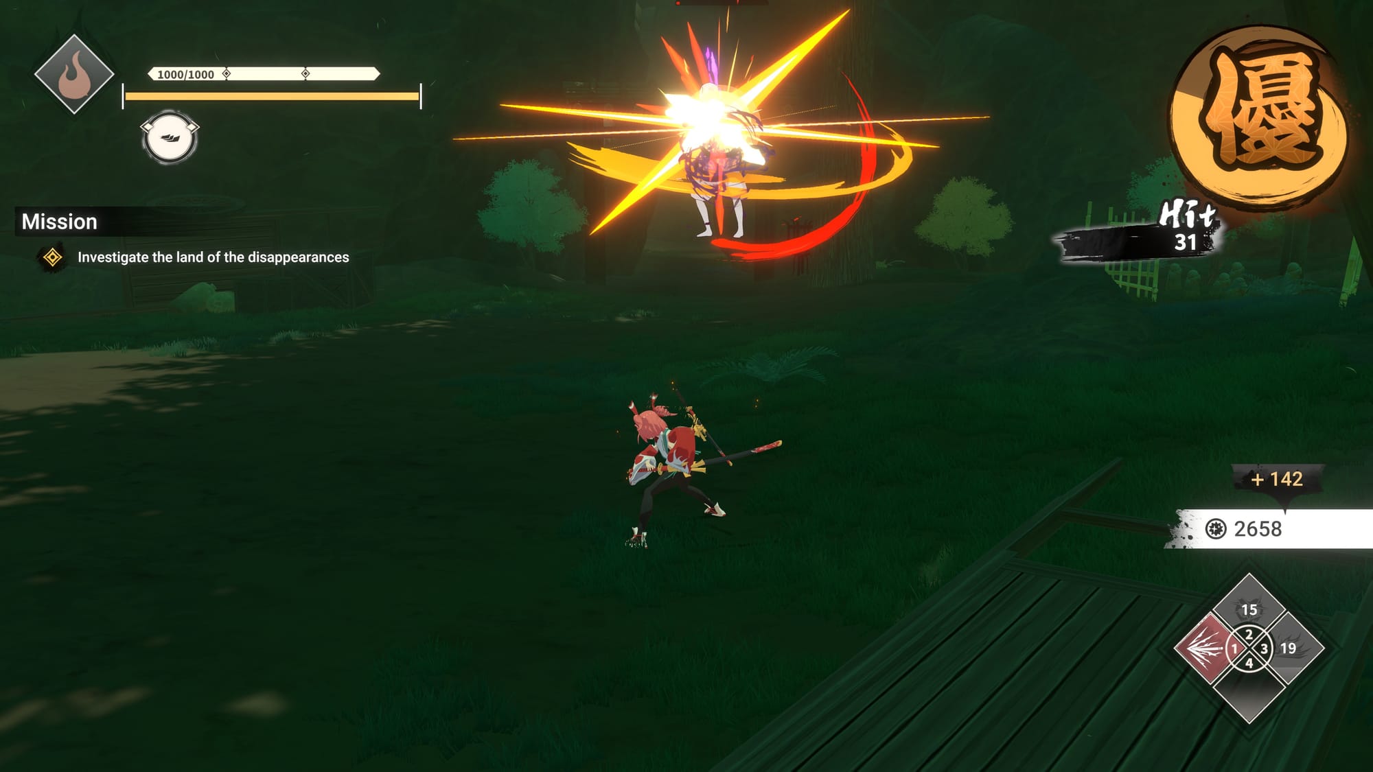 Secondly, the combat is smooth. Bullet hell portions are left for (mini)bosses, and they also have quite cinematic finishers. Meanwhile regular enemies are dispatched with combos that have you dodging attacks and laying smackdown on the various minor demons. It genuinely flows great, even if there may not be anything super revolutionary in there. It's the mixture that matters, not the components!