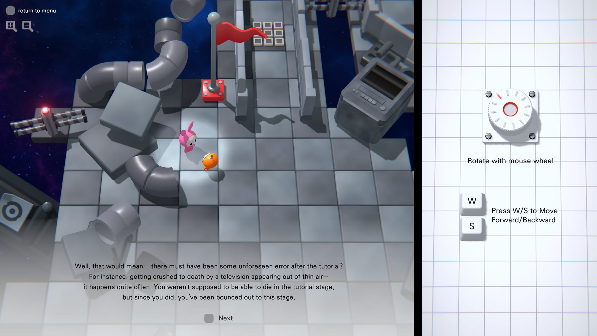 A game where you go forward with a lil dude through a seemingly simple 2D obstacle course. The catch is that every few hundred meters your controls change, from standard WASD, through randomized keys, up to controlling your rotation with keys, and speed with a thrust lever added to the screen. It's very creative, but also very punishing as the moment you hit an obstacle or a wall you get catapulted down the track, often hundreds of meters. Worth giving a whirl if you don't get frustrated easily